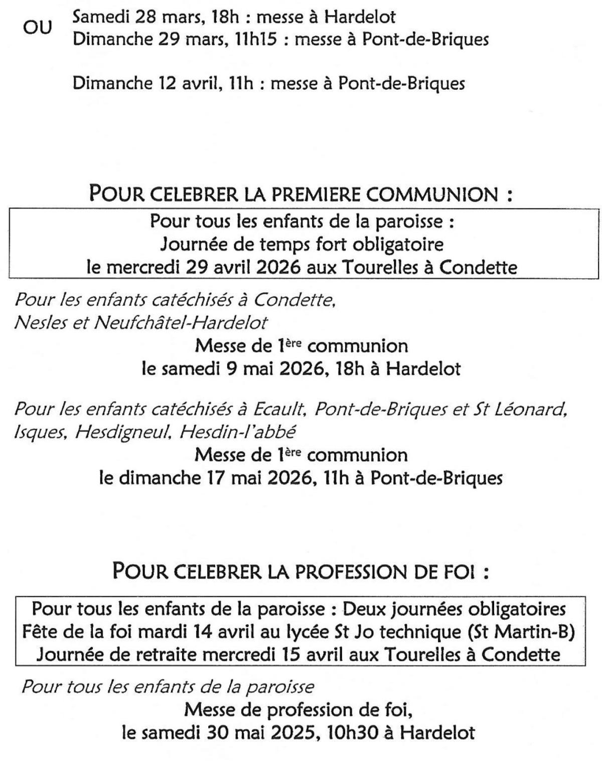 Diverses propositions sont faites pour favoriser l'éveil à la foi pendant la petite enfance (3 ans 7 ans) : Célébrations festives avec d'autres familles pour Noël et Pâques. Une nouvelle proposition pour les enfants de 7 ans : Puis à partir du C.E.2 et durant 4 ans, les enfants se retrouvent chaque semaine en petite équipe de 6-7 avec un ou une catéchiste bénévole